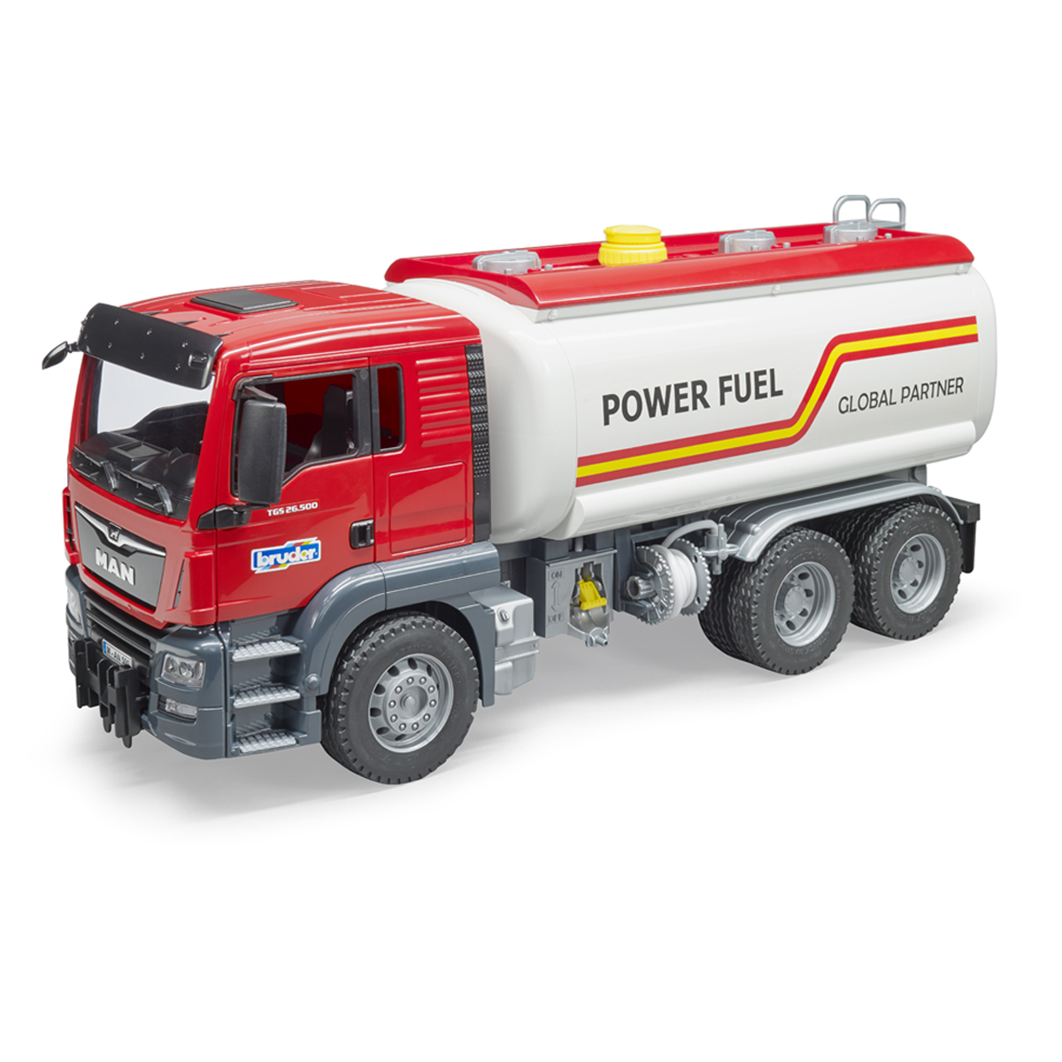 Le MAN TGS est le modèle polyvalent par excellence pour les chantiers, le trafic à grande distance et la distribution. De fabrication robuste, doté de moteurs puissants et capable de supporter une charge utile supérieure à la moyenne, ce camion est le prototype du véhicule à tout faire avec une foule d’innovations. Le modèle Bruder du camion-citerne MAN TGS à l’échelle 1:16 est une combinaison alliant la nouvelle cabine MAN et la nouvelle structure de camion-citerne. Ce nouveau réservoir entièrement fonctionnel offre une foule de nouvelles fonctions au pilote miniature du camion-citerne. Le réservoir peut être rempli d’eau. Une pression est générée à l’aide de la pompe à air manuelle intégrée et l’unité de sortie latérale peut faire couler l’eau dans le tuyau en actionnant le levier de retenue. En complément idéal au camion-citerne MAN TGS, BRUDER propose une remorque-citerne (réf. 03925) qui convient parfaitement à ce camion-citerne attrayant et forme un attelage de près d’un mètre de long. BRUDER propose également de nombreuses figurines bworld. Elles peuvent être installée dans la cabine ou monter sur l’échelle à l’arrière du véhicule pour inspecter le réservoir du haut. Le module son et lumière (réf. 02801) peut également être ajouté à ce modèle.