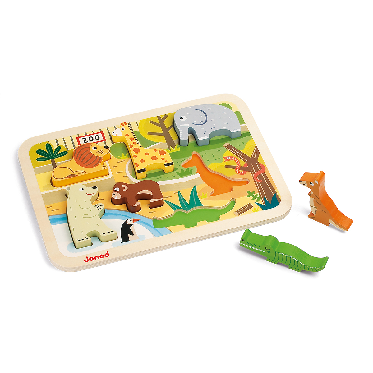Chuncky Puzzle zoo 7pcs. 30x2.1x21cm. Saurez-vous replacer ces six animaux à leur juste place dans le zoo? Un jeu d'encastrement pour les tout petits qui les initiera aux formes et aux couleurs. Les pièces étant en bois massif, l'enfant pourra également les manipuler à loisir et faire jouer les animaux dans des histoires sorties tout droit de son imagination. Pour enfants dès 18 mois.