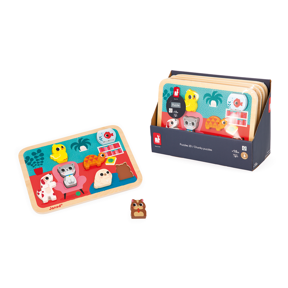 Bulle le poisson fait des tours dans son bocal tandis qu'Holly le perroquet observe ses amis animaux. Grâce à ce puzzle chunky, votre enfant pourra se familiariser et s’amuser avec les animaux domestiques. Les pièces épaisses sont adaptées à ses petites mains pour faciliter leur préhension. L’enfant pourra positionner correctement les 7 pièces sur le plateau en bois ou alors les utiliser comme figurines. Ce puzzle est idéal pour développer la motricité fine et favoriser l'imagination. Puzzle en bois et peinture à l'eau. Jouet d'éveil pour les enfants à partir de 18 mois.