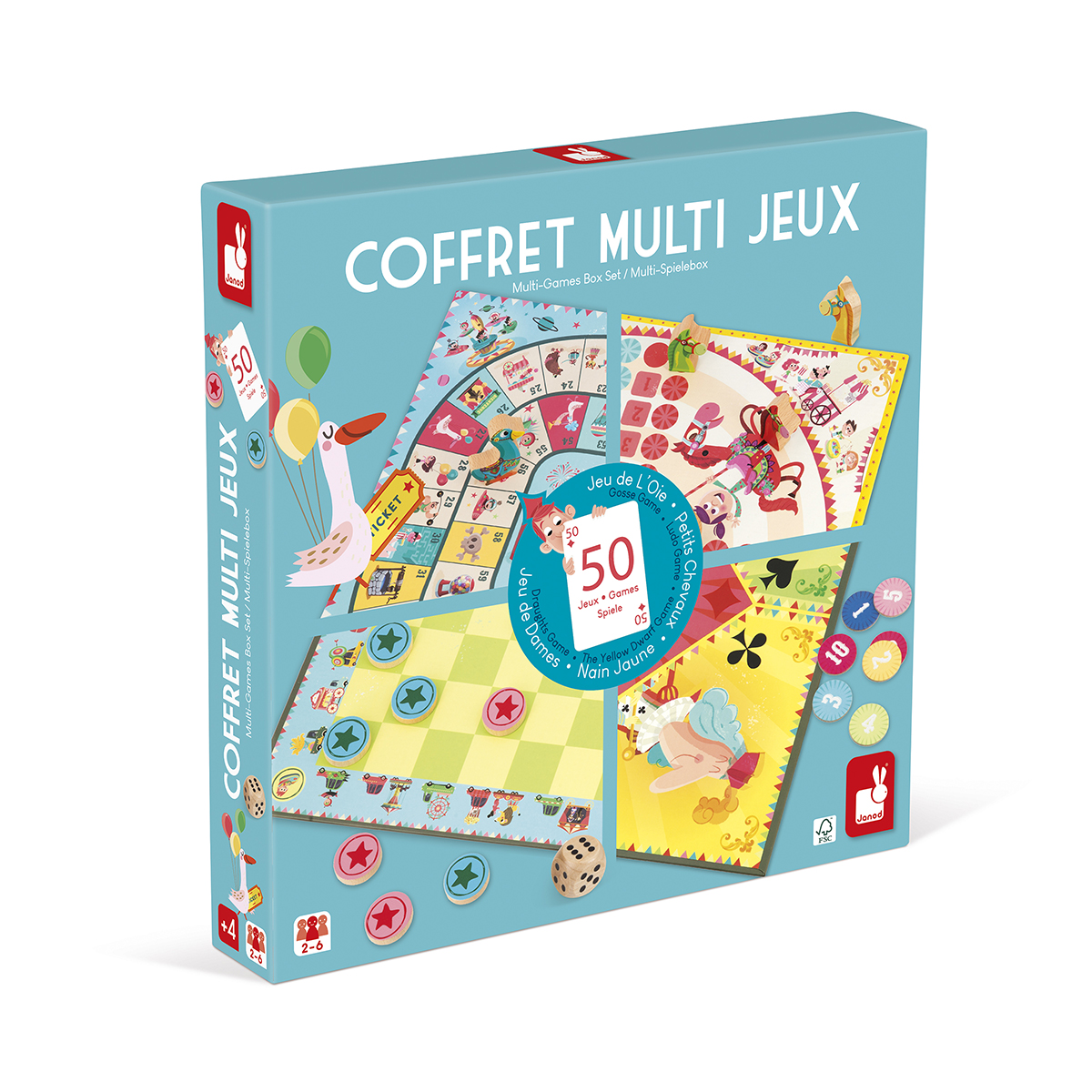 Coffret de jeux comprenant:1 jeu de l’oie, 1 jeu de petits chevaux, 1 jeu de dames, 1 jeu de nain jaune, 1 jeu de 7 familles, 1 jeu de 54 cartes, 5 dés et un livret de 50 règles du jeu. Les pions des petits chevaux, jeu de l’oie, jeu de dames et des dés sont en bois massif. 50 jeux réunis dans un coffret sur la thématique de la fête foraine avec des jolies illustrations colorées ! Le coffret idéal pour des heures de jeu à partager en famille ou entre amis ! Les pions sont imprimés en transfert à chaud. Règles du jeu incluses en 3 langues (français, anglais, allemand). 2 à 6 joueurs. Boite cloche