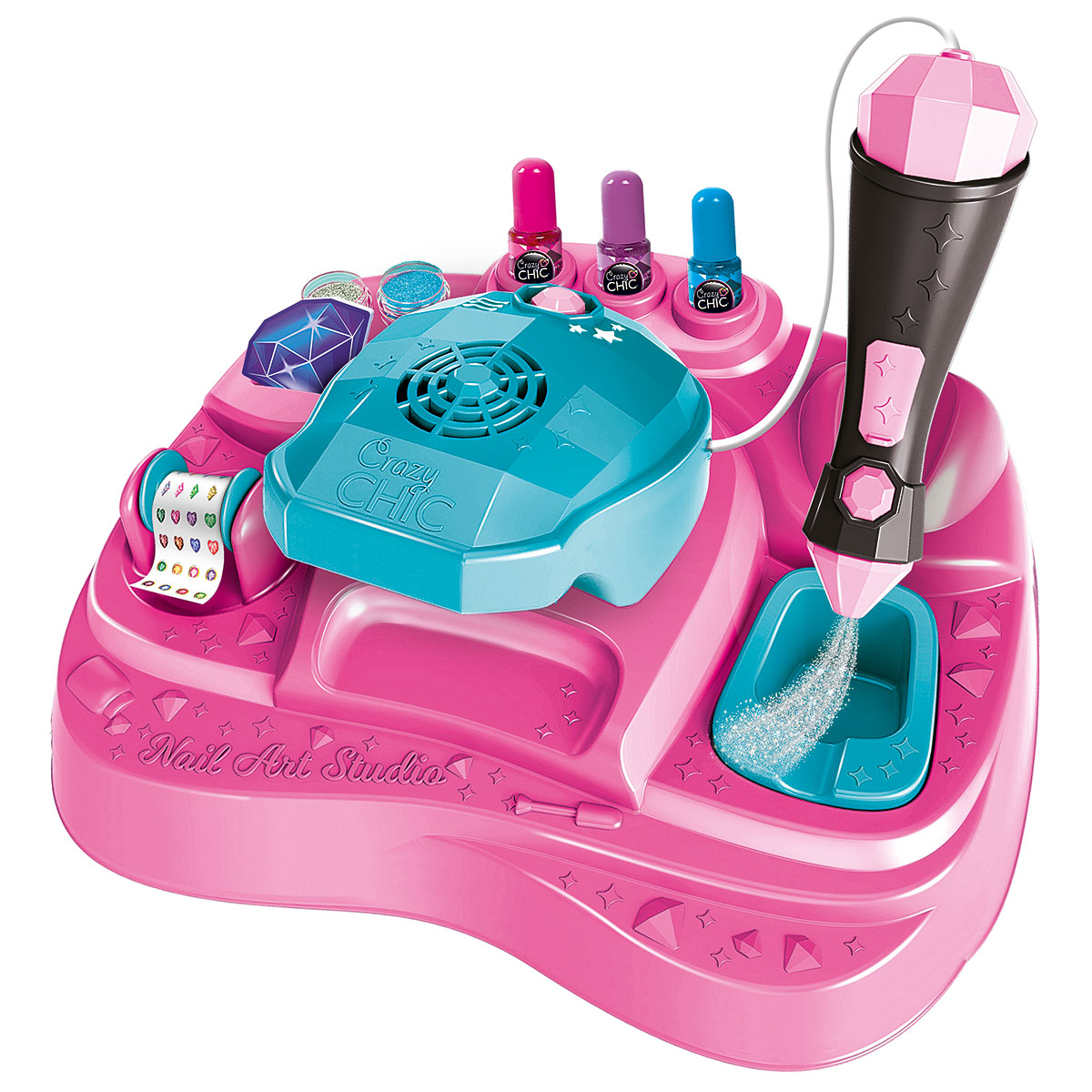 Crazy Chic Nail Art Studio. Une toute nouvelle station de travail innovante au design moderne et ergonomique pour les super artistes de l'ongle du futur ! Les vaporisateurs de paillettes et les séchoirs à vernis à ongles garantissent un look vraiment tendance. Le kit contient des vernis à ongles Crazy Chic, des stickers pour les ongles et des paillettes colorées pour des décorations super glamour !