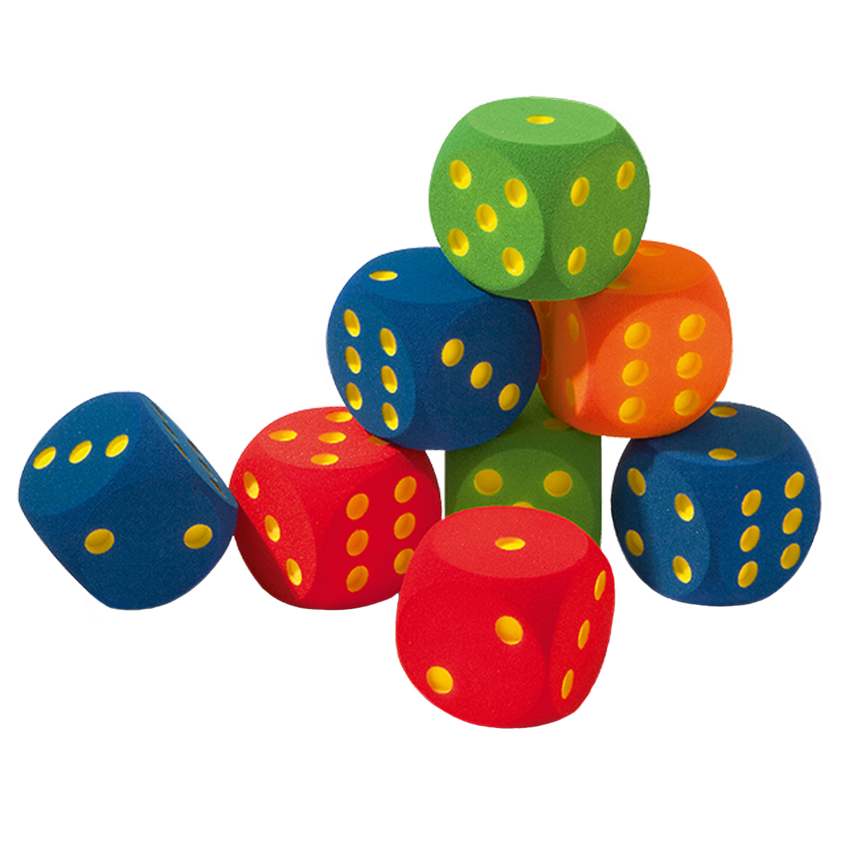 Cube 16cm en caoutchouc mousse en rouge, bleu ou vert avec points jaunes et coins arrondis