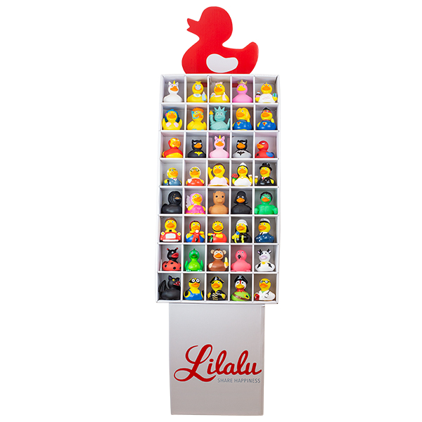 Collection de départ pour 40 canards en caoutchouc. Taille 43x35x150cm. Matériau: Carton coloré avec impression brillante