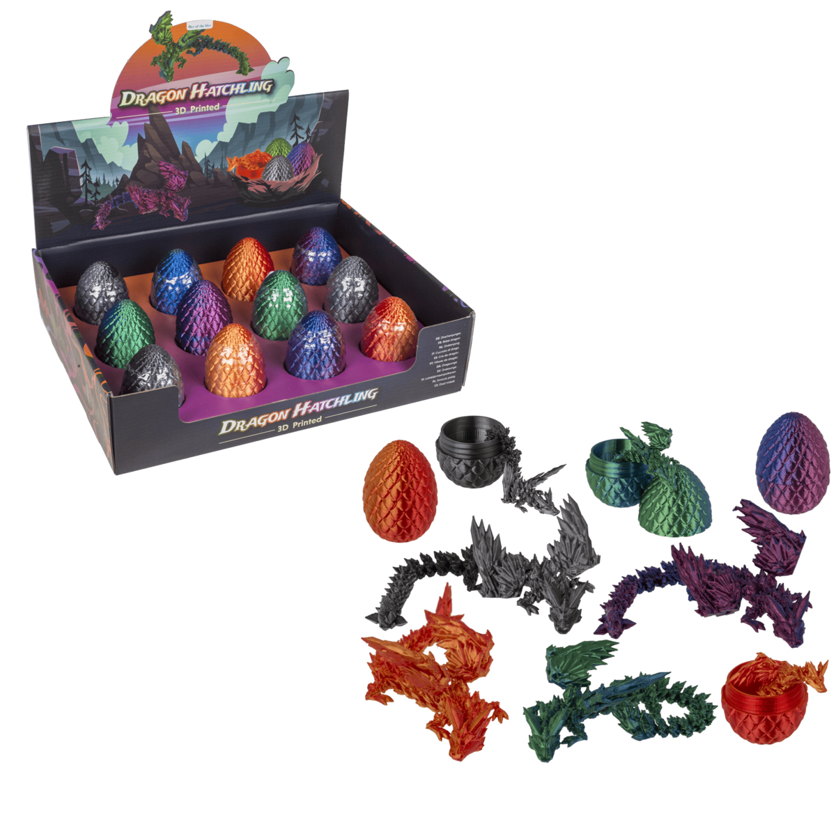 Dragon imprimé en 3D avec œuf. 4 couleurs assorties, 12 pièces dans un présentoir