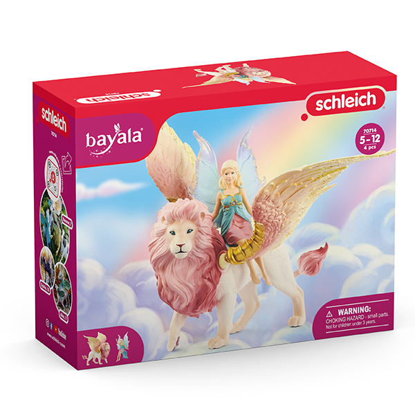 Dans le monde de bayala®, les habitants lèvent des yeux émerveillés vers le ciel, où vole gracieusement un adorable elfe monté sur le dos d'un lion ailé. Cette créature magique à la crinière rose et aux ailes étincelantes plane délicatement avec l'elfe au-dessus de bayala.