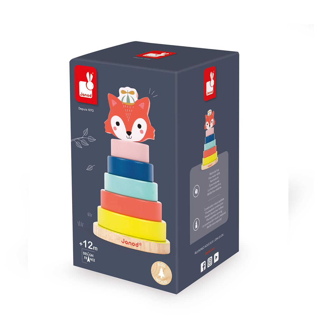 Empilable Renard 10x10x17.5. Votre enfant va s'amuser à empiler les 6 anneaux et la tête du renard sur la tige afin de reformer l'animal. Un beau jouet en bois pour la dextérité et l'éveil de votre enfant , qui fera un très beau cadeau de naissance servant également de décoration de chambre.