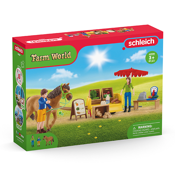 Avec l’étal mobile de la ferme FARM WORLD de Schleich®, Ben et sa mère Laura peuvent proposer leurs produits frais à la vente!