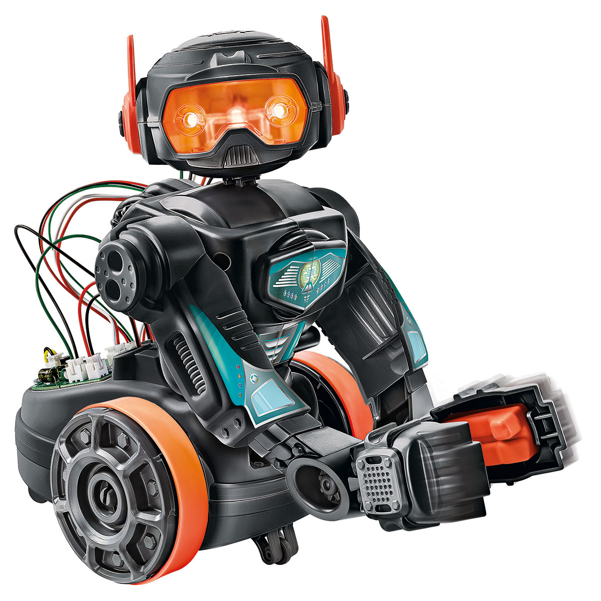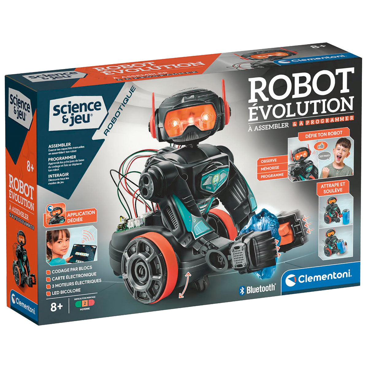Evolution Robot. Un jeu conçu pour enseigner aux enfants les principes de la robotique avec une approche STEM intégrée et amusante. Ce nouveau robot est destiné à être assemblé et programmé, ce qui aide les enfants à acquérir des compétences manuelles et de résolution de problèmes, ainsi qu'une pensée logique. L'application spéciale comporte diverses fonctions qui leur apprendront les principes du codage. Le robot est doté de bras mobiles qui lui permettent de soulever et de déplacer de petits objets. Des moteurs électriques, un adaptateur bluetooth, un haut-parleur et des lumières LED intégrées rendent ce jouet encore plus amusant.