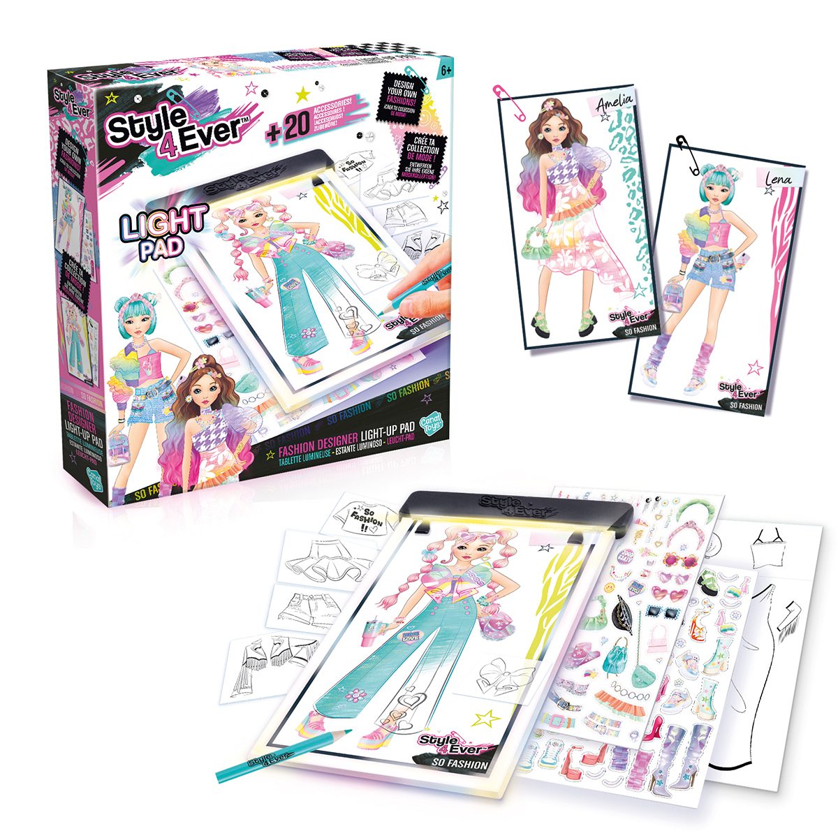 Montre ton talent de styliste et crée ta collection avec ce Fashion Light-up Pad ! Créez de nouvelles combinaisons de tenues avec les pochoirs, illuminez vos styles de mode ! Les accessoires inclus te permettront de réaliser facilement de nombreuses tenues.