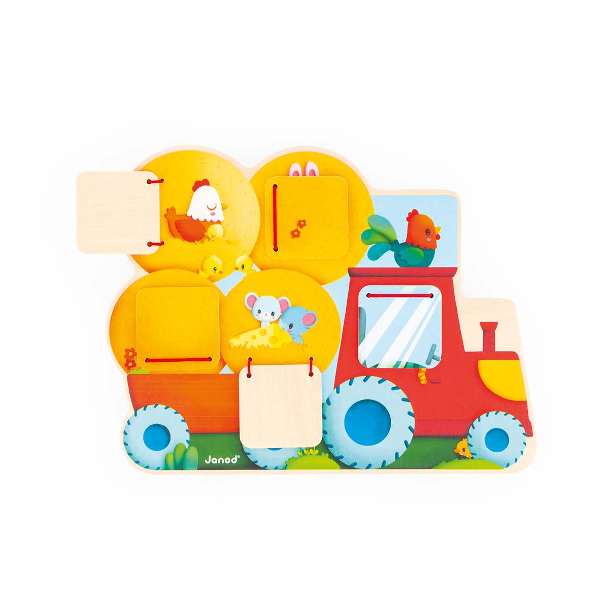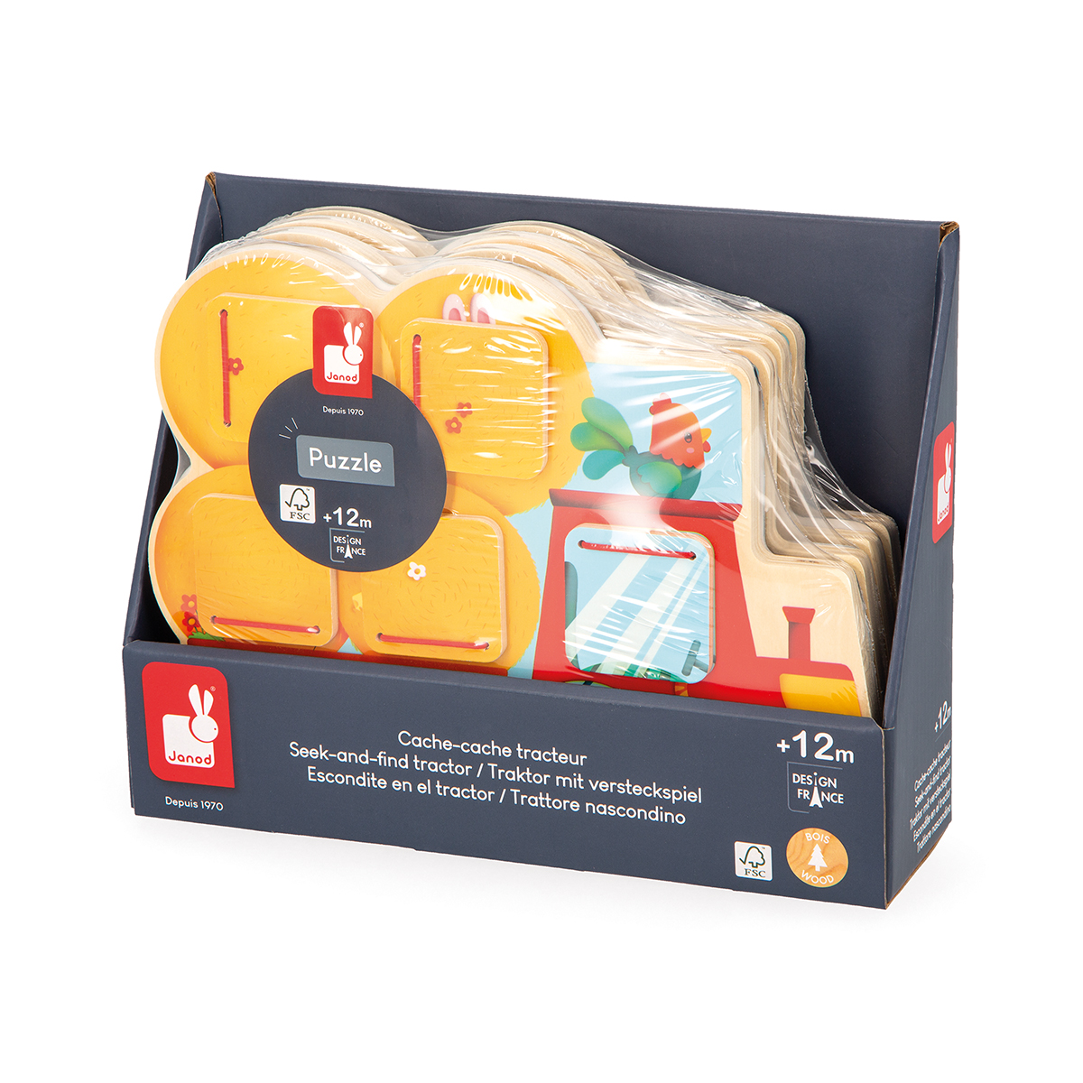 Partez à la découverte des animaux de la ferme avec ce joli jeu de cache-cache en bois en forme de tracteur ! Derrière les 5 fenêtres se cachent des animaux tout mignons. D'ailleurs, un petit indice s'est glissé à côté de chaque fenêtre pour guider votre enfant sur l'animal caché. Votre enfant pourra développer sa capacité d'observation ainsi que sa motricité fine. Jouet d'éveil en bois, puzzle pour les enfants à partir de 12 mois.