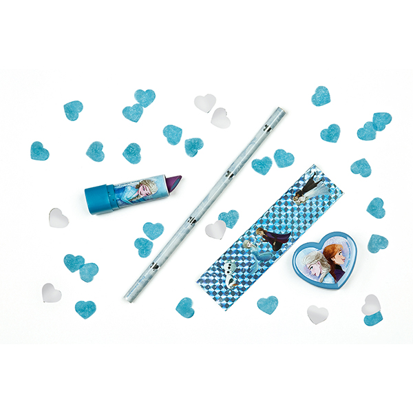 Gobelet à paille rempli de paillettes, avec crayon, gomme pour rouge à lèvres et taille-crayon en forme de cœur.