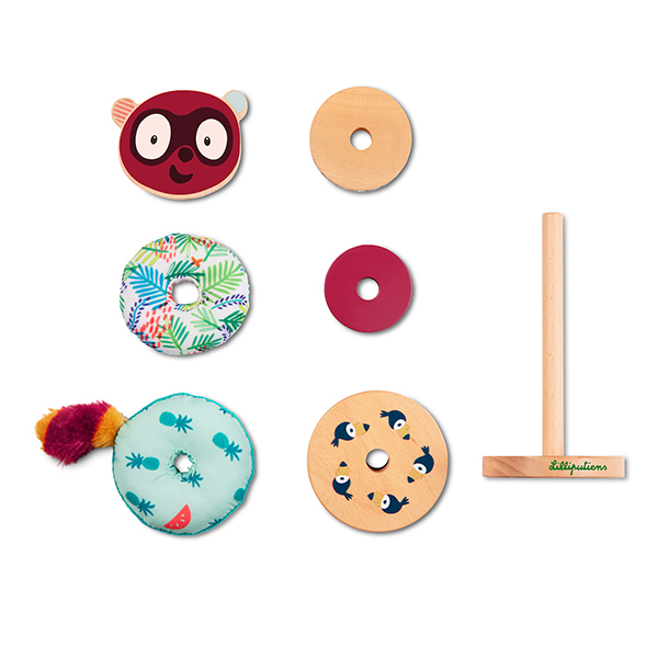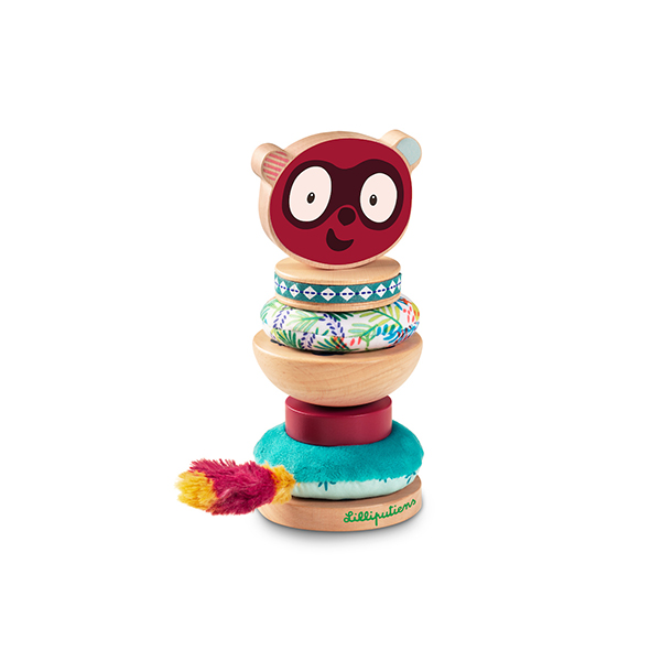 Pyramide d'empilement joyeuse pour promouvoir la motricité fine. Les éléments de cette pyramide peuvent être empilés de manière créative. Différents matériaux et couleurs stimulent les sens.