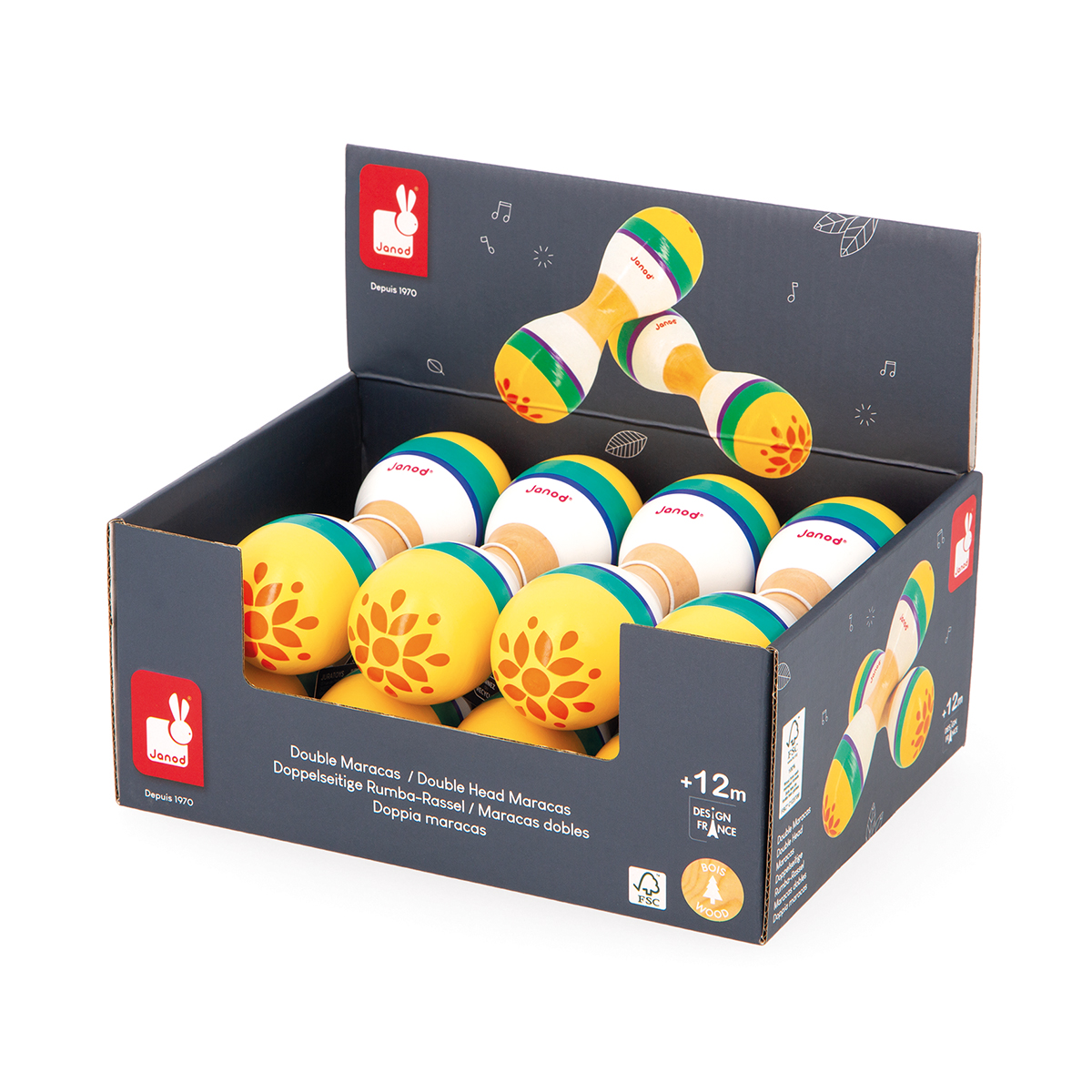 Tchiik, tchiik!! Les petits pourront jouer le rythme en secouant joyeusement cette double maracas, parfaitement adaptée à leurs petites mains! Les jouets musicaux éveillent tous les sens et permettent aux plus jeunes musiciens de s'initier aux joies de l'improvisation musicale. Les billes sont encapsulées dans une coque en plastique pour éviter tout risque d'ingestion. Jouet d'éveil musical en bois. Pour les enfants à partir de 12 mois.