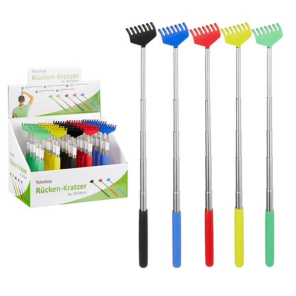Gratte-dos téléscopique 56cm en display de 25 pièces en 5 couleurs différentes (rouge, bleu, vert, noir, jaune).