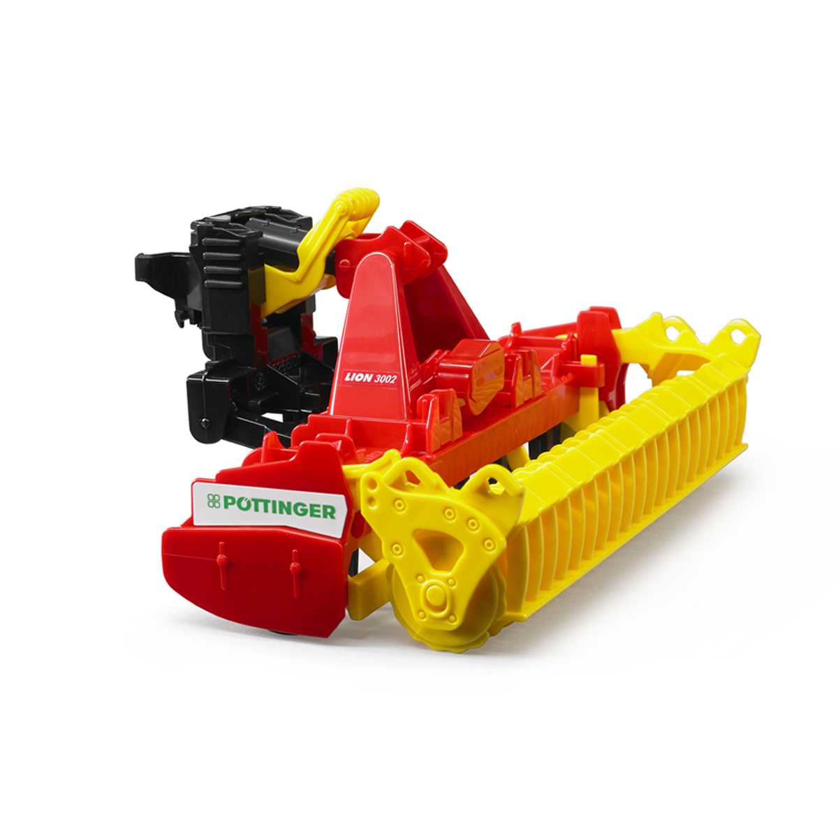 La herse rotative Lion 3002 de Pöttinger sert au traitement des terres agricoles et elle est notamment utilisée pour la préparation des semailles avant l'ensemencement. Le modèle est équipé de l'adaptateur spécifique BRUDER qui permet de monter la herse rotative sur tous les tracteurs de la gamme. Grâce au mécanisme de levage intégré, il est possible de simuler la position de transport et la position de travail comme sur l'original en levant et en abaissant l'unité. En position de travail, le rouleau compresseur rotatif se charge du traitement du sol, tandis que de nombreux autres détails complètent l'apparence du modèle et rendent ainsi le jeu encore plus réaliste.