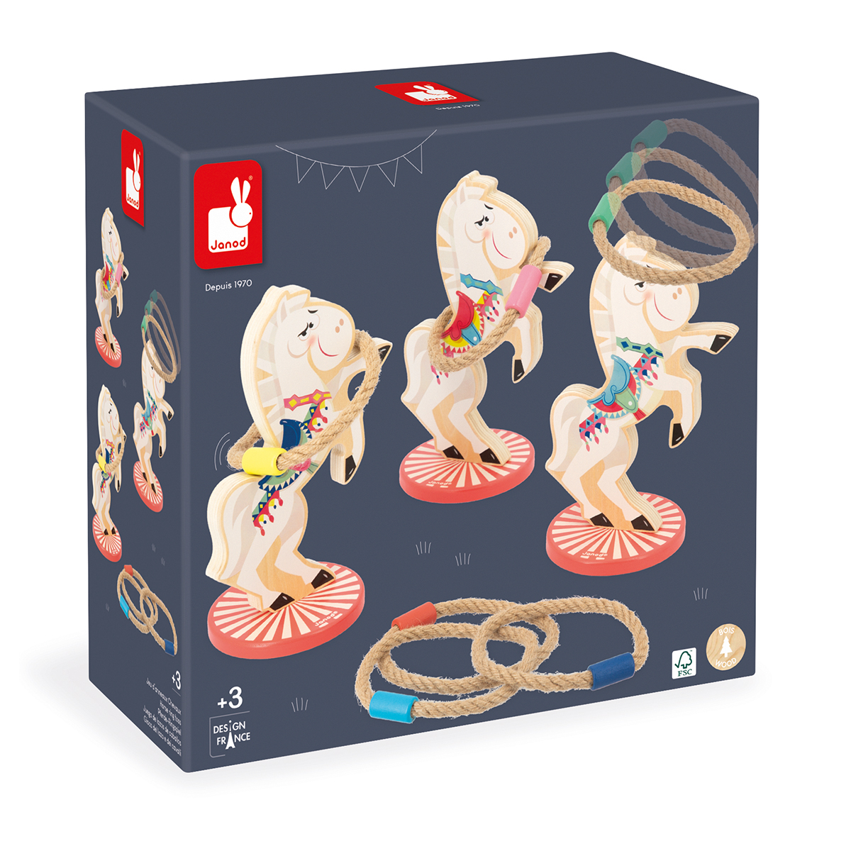A vos lassos ! Combien de chevaux pouvez-vous attraper avec 6 lancers ?… Ou combien de lancers vous faut-il pour attraper 1 cheval ? 3 chevaux ? À vous d’inventer vos propres règles ! Développe la coordination main-œil et la concentration. Jeu composé de 3 chevaux en bois et de 6 grosses cordes à lancer. Jeu d’adresse en bois pour les enfants à partir de 3 ans. Pour 1 joueur et plus.