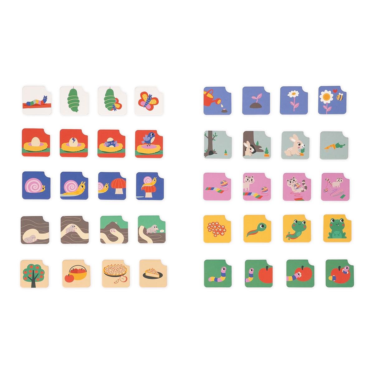 Comment se forme un papillon? Comment une graine se transforme-t-elle en fleur? Accompagnez votre enfant à la découverte de la nature grâce aux cartes séquences. Le but du jeu est de retrouver la chronologie de chaque action. 10 actions de 4 étapes sont proposées dans le jeu, soient 40 cartes, ainsi qu'un support en bois. Grâce à l'atelier autonome votre enfant apprendra à classer des actions chronologiquement, à développer sa réflexion et son attention. Un système d'autocorrection est également disponible. Dans le cadre de l'atelier Duo, vous pourrez accompagner votre enfant dans son apprentissage: laissez-le placer les cartes sur le support, puis vous expliquer le déroulement de la scène. Jeu en bois et carton. Jeu éducatif développé en collaboration avec une institutrice pour les enfants à partir de 3 ans.