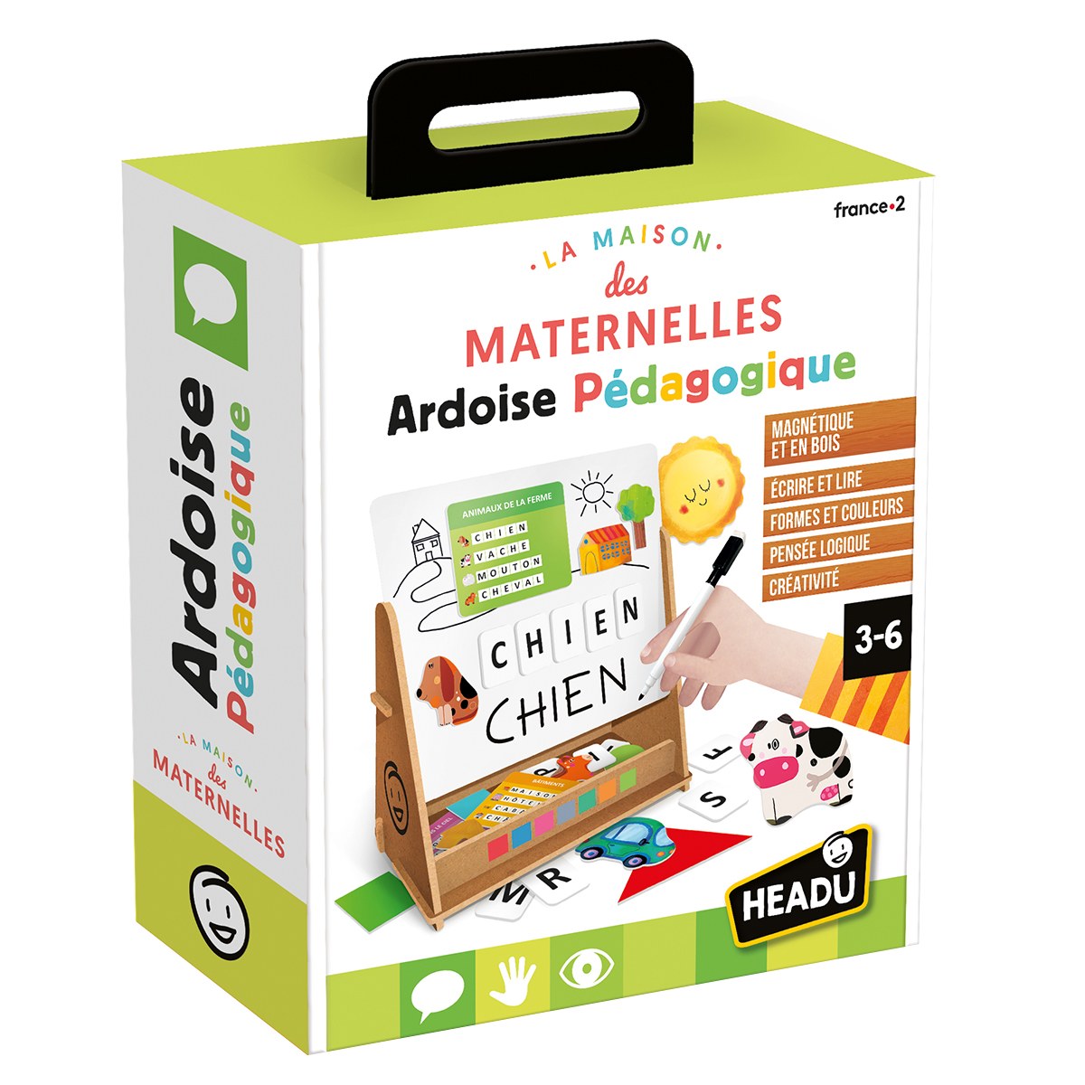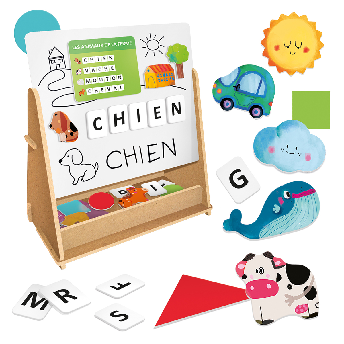 Un riche kit de matériel pédagogique et 100 aimants pour apprendre de nombreux nouveaux mots, formes et couleurs. Avec le tableau magnétique spécial et en bois, vous pouvez apprendre à écrire et à lire de manière originale et amusante.