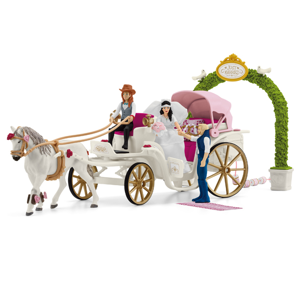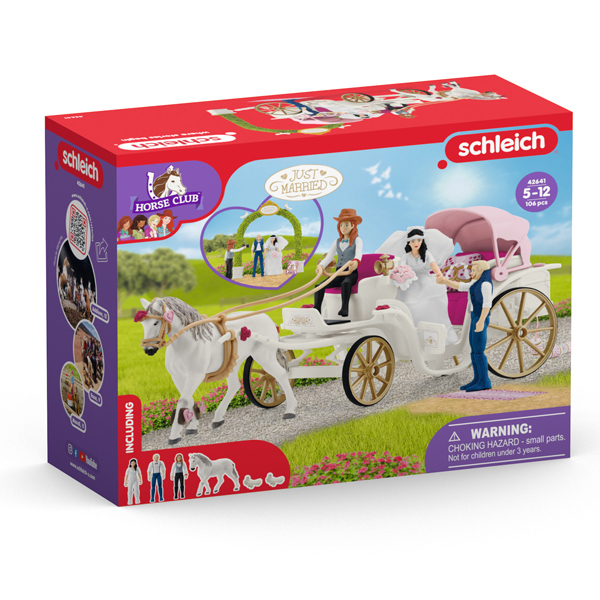 Dans sa robe de mariée, Emily est absolument rayonnante, et Toby le marié a enfilé son plus beau costume. Assis côte à côte, ils conduisent la calèche des mariés à laquelle ont été accrochées des boîtes de conserve. Pour l’occasion, Hannah a donné au Lipizzan et à la calèche des décorations de fête. Le cheval porte des jambières ornées de petits cœurs, et même son harnais est couvert de cœurs. Confortablement installés sur la banquette rouge de la calèche, les mariés ont des coussins en forme de cœur et sirotent un verre de champagne. Tiens, qu’est-ce que c’est? Un compartiment secret sous la banquette! Il contient des pommes pour le Lipizzan attelé à la calèche.