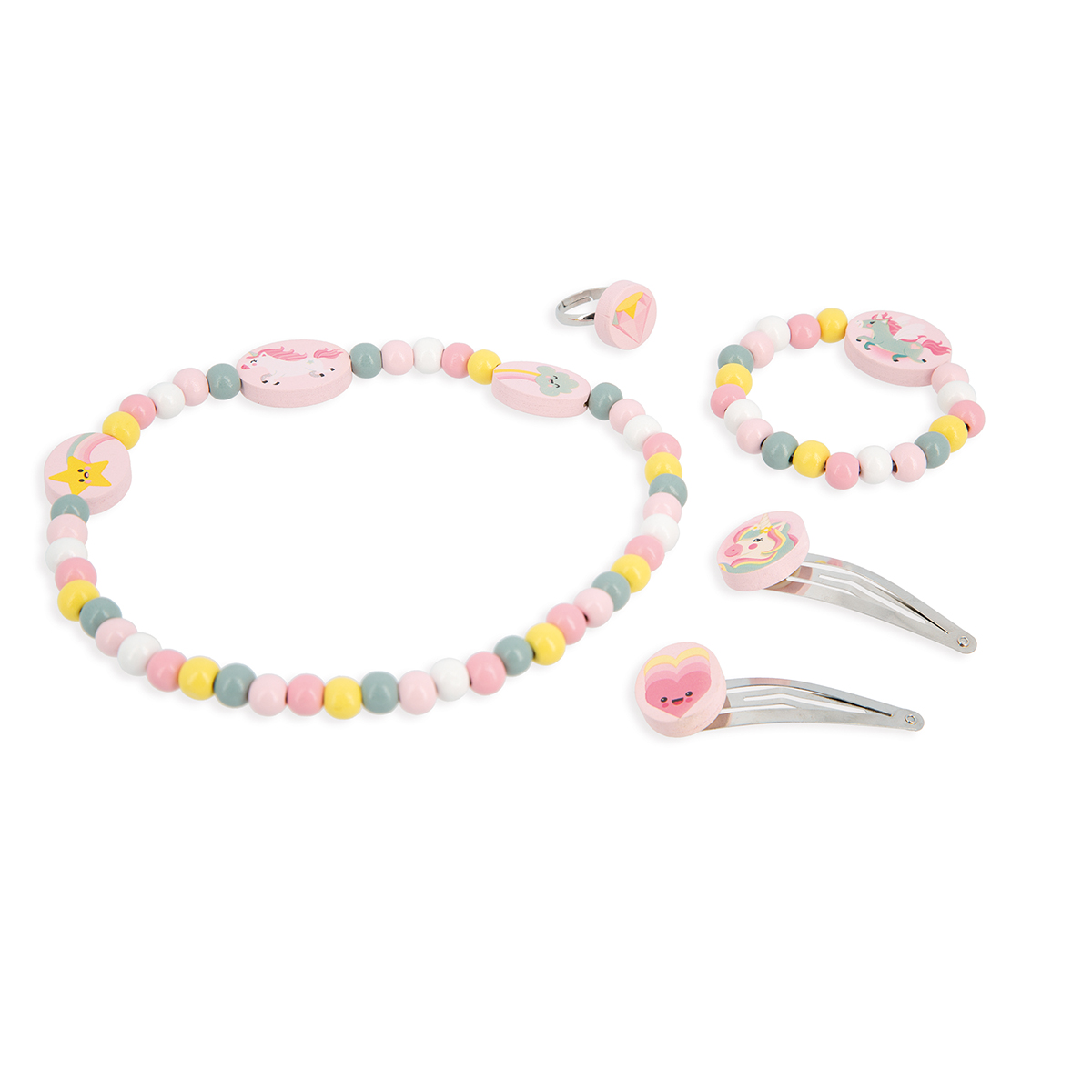 Ajoutez une touche de fantaisie à la tenue de votre enfant avec cet ensemble de bijoux en bois, inspiré de jolies illustrations sur le thème de la licorne. Contient un collier, un bracelet, une bague et deux pinces à cheveux. Retrouvez la boite à bijoux nuage Janod de la même collection pour ranger vos bijoux ! pour les enfants à partir de 3 ans.