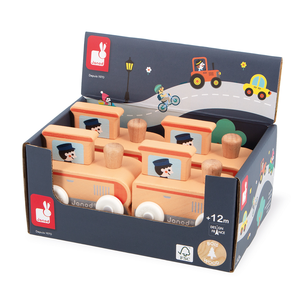 TCHOU - TCHOU ! C'est parti pour le grand voyage à bord du train. Imaginez un beau et grand voyage avec la locomotive en bois. Grâce à sa forme la locomotive est facile à prendre ne main pour les tout petits. Jouet en bois, pour les enfants à partir de 12 mois. Associé à ton tapis et au joli coffret de cube de la gamme Janod, ce roulant complète parfaitement ton univers.