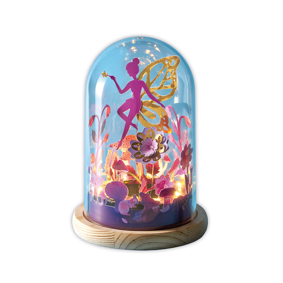 Une cloche de fées magique ! Ce coffret créatif permet de réaliser une scène végétale nocturne avec des champignons, des fleurs et une silhouette de fée à éclairer avec une guirlande lumineuse. Il contient une cloche en plastique avec socle en bois, une guirlande lumineuse avec piles incluses, un disque en mousse, du fil de fer, des pastilles autocollantes, 2 planches illustrées prédécoupées, 1 planche dorée prédécoupée et 1 livret avec les instructions et les modèles. Cette activité permet de développer sa créativité et sa patience et néessite environ 45 minutes. Elle est idéale pour les enfants à partir de 7 ans.