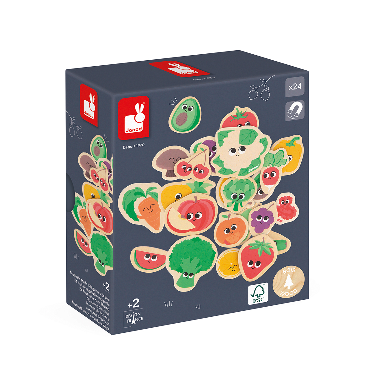 Vous avez tout sous la main pour préparer une bonne salade composée ! Fruits et légumes, aidez votre enfant à les reconnaître et à les associer ! Ce set est composé de 24 magnets en bois pouvant être positionnés sur des tableaux magnétiques, ou toute autre surface aimantée. Votre enfant pourra développer son imagination et sa motricité fine tout en s'amusant. Jouet magnétique en bois pour les enfants à partir de 2 ans.