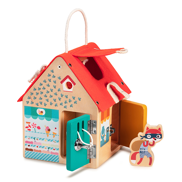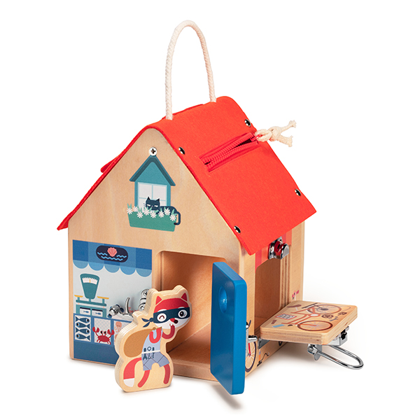 Attention ! Un cambrioleur rusé se promène. Il faut vite vérifier que toutes les serrures de la petite maison sont bien verrouillées. Ou peut-être es-tu le complice du cambrioleur et est-ce toi qui ouvre toutes les serrures pour lui ? Cette petite maison permet aux bambins de faire connaissance de manière ludique avec différents systèmes de fermeture et stimule aussi l’imagination.