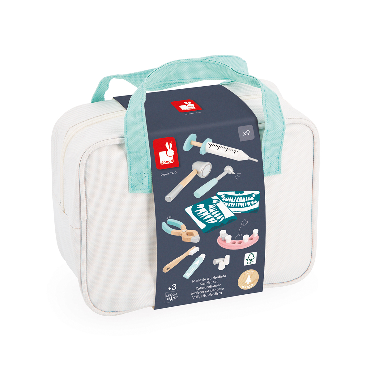Une carie? Ne bougez pas! Bzzzzzz. Cette jolie mallette contient 9 accessoires: une seringue, une pince, une brosse à dents, un dentifrice, un miroir dentaire, un dentier avec huit dents amovibles, une turbine et deux cartes avec une radio de la mâchoire. Parfait pour faire comme chez le dentiste! Tout en étant ludique, ce jeu est pédagogique pour enseigner à votre enfant l'importance de prendre soin de ses dents! Jouet en bois FSCTM et peinture à l'eau. Jouet d'imitation pour les enfants à partir de 3 ans.