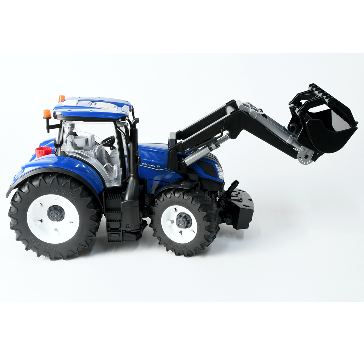Pour l’agriculture moderne, des tracteurs puissants sont nécessaires. C’est pourquoi la série T7 Heavy Duty de New Holland a été conçue avec un accent sur la polyvalence et la puissance. Jusqu’à 313 CV peuvent être mis en action avec le nouveau New Holland pour l’utilisation de lourds outils de travail. Ce tracteur est suffisamment robuste pour des tâches de traction, de travail du sol, de presse de balles et de transport. En matière de design, de fonctionnalité et de qualité, le nouveau modèle de BRUDER à l’échelle 1:16 se montre à la hauteur de l’original, fidèle au slogan - just like the real thing. La cabine est entièrement vitrée et les portes s’ouvrent facilement. Le capot du moteur rabattable permet de voir le moteur imposant. L’essieu oscillant intégré et la prolongation du volant traversant le toit ouvrant garantissent un excellent niveau de manœuvrabilité et de confort de conduite. Pour encore plus de plaisir de jeu, un chargeur avant entièrement fonctionnel peut être monté sur ce modèle. Un double pneumatique (310.03317) peut également être ajouté. Le dispositif d’attelage arrière réglable en hauteur est compatible avec toutes les remorques de la série Profi. Pour encore plus de plaisir de jeu, les nouvelles roues amovibles sont incluses. L’extension avec le kit de figurines Atelier (310.62100) augmente encore la valeur ludique de ce superbe article. Tous les outils de travail et remorques agricoles de la gamme BRUDER sont bien entendu compatibles avec ce tracteur. Un module son et lumière (310.02802) peut également être ajouté en complément à ce jouet.
