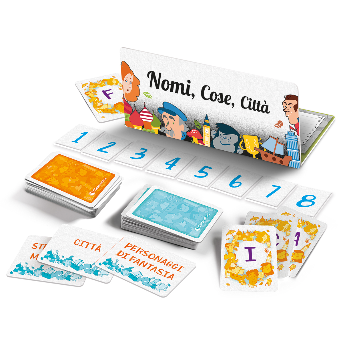 Nomi, Cose, Città IT. Un gioco perfetto per lasciare tutti gli altri...senza parole! Contiene: un mazzo di carte Categoria (Nomi, Cose e Città...), un mazzo con le lettere dell’alfabeto, blocchetti per scrivere le parole e una clessidra per segnare il tempo. Un gioco di velocità in cui bisogna scrivere una parola per ognuna delle categorie in gioco e che inizia con la lettera dell’alfabeto indicata.