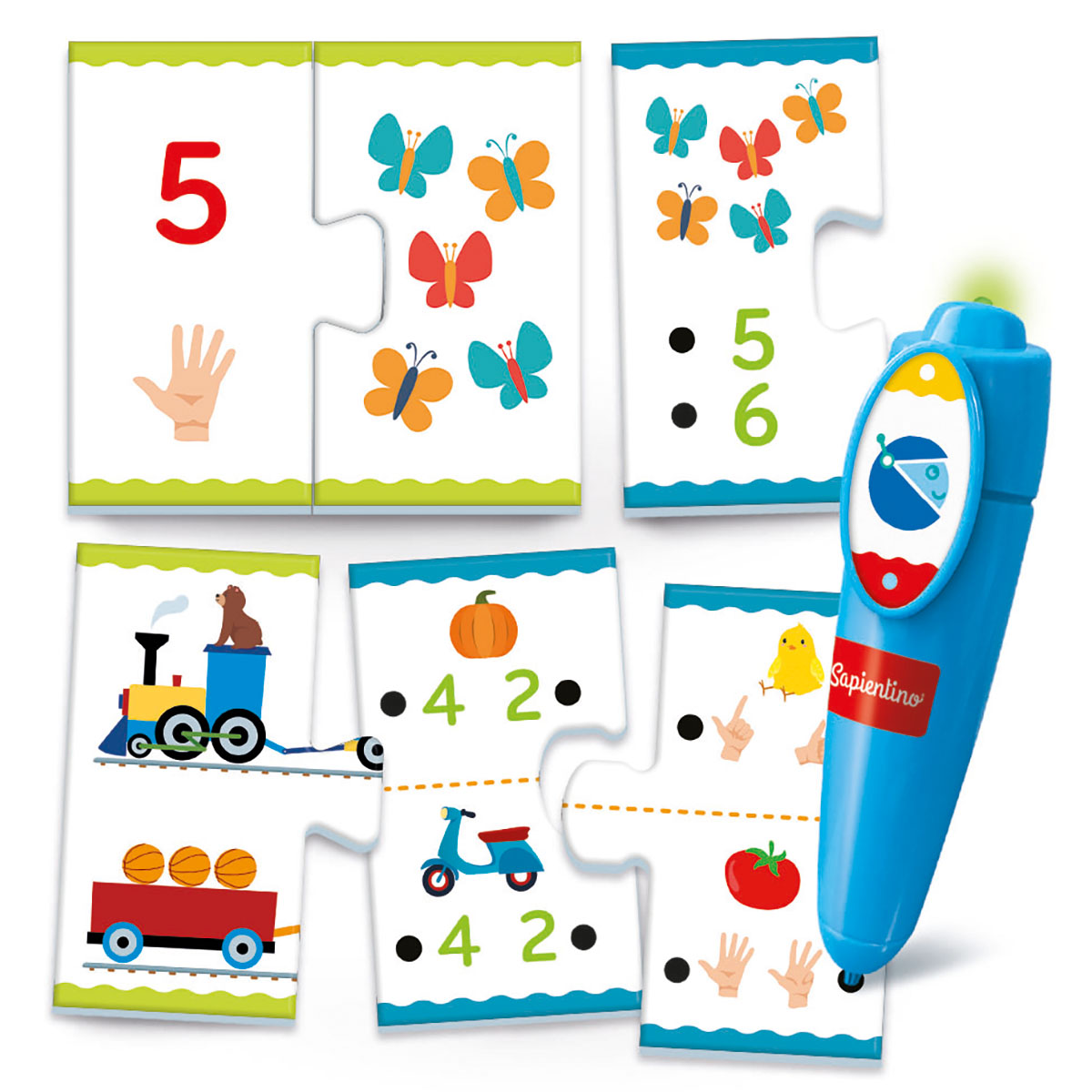 Penna Interattiva-Numeri. Ricomponendo i mini-puzzle dalla parte del fronte, i bambini associano numeri e quantità. Voltando le tessere rispondono ai quiz con la penna interattiva. La penna segnala le risposte giuste, in questo modo il bambino è in grado di progredire nel gioco in autonomia.