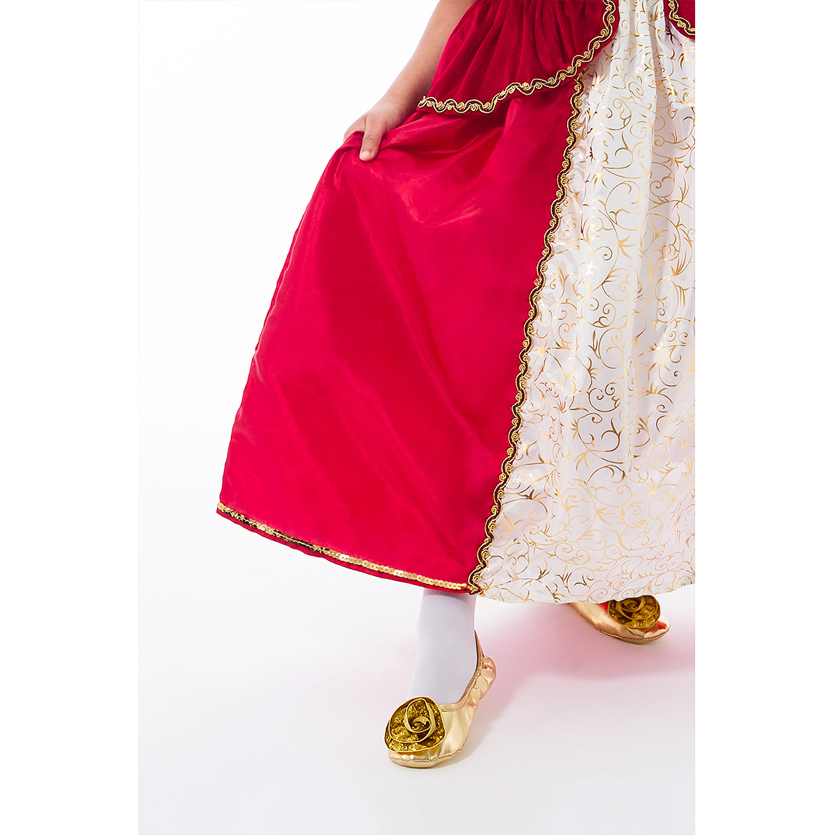 Cette robe est un véritable classique et parfaite pour l’automne, l’hiver ou en réalité toute l’année. Elle constitue un complément idéal à la collection de costumes de votre enfant. Le haut en velours extensible rouge foncé est orné d’un motif matelassé, de galons dorés et d’une rose rouge. Les manches mi-longues avec galons dorés se terminent par un magnifique volant blanc. La jupe rouge en soie de Chine avec un empiècement ivoire à motif tourbillonnant doré scintillant complète le look luxueux de cette robe. Respirant, doux comme de la soie, 100 % polyester.