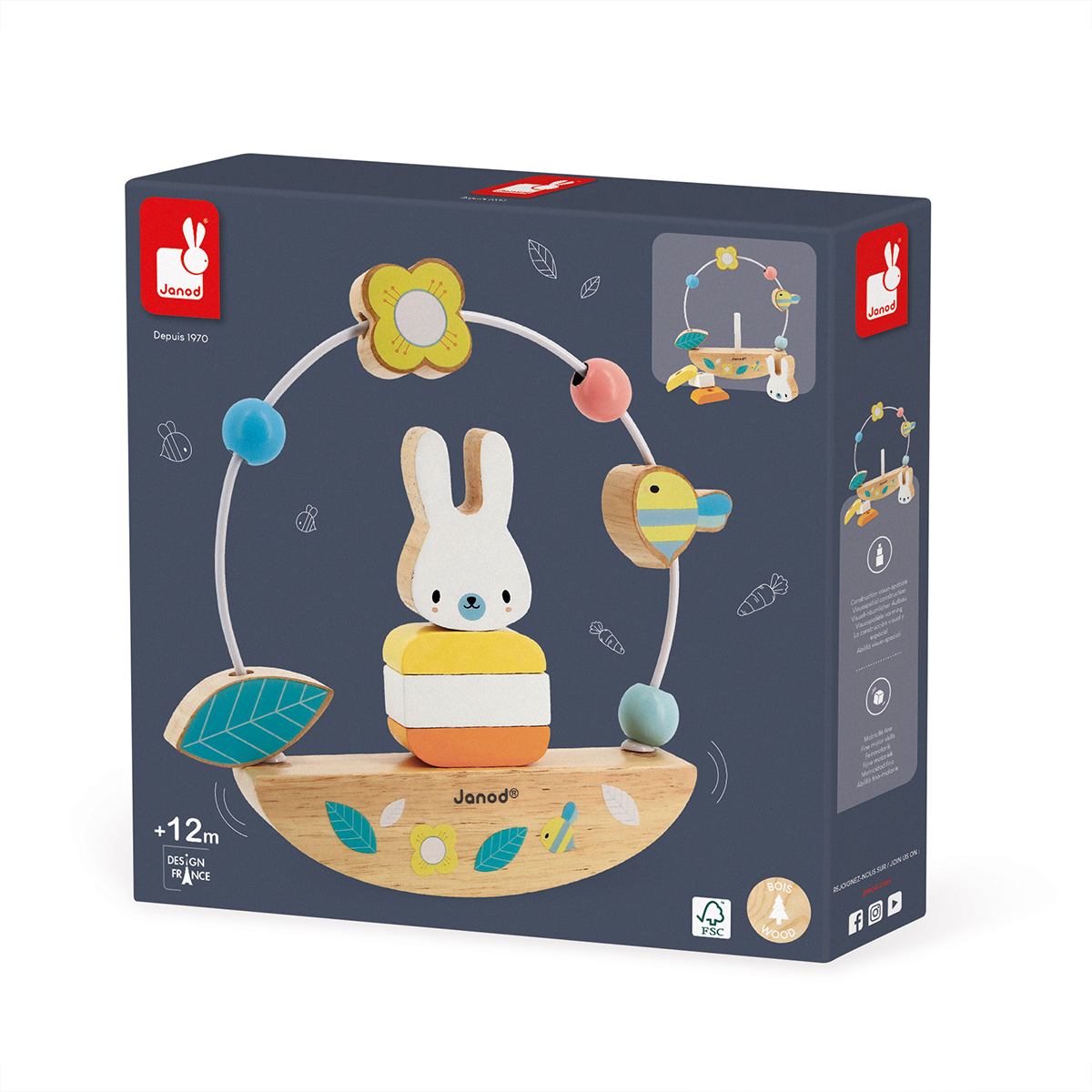 Découvrez un petit lapin aux couleurs douces qui s’empile, bascule et virevolte à l’infini! C’est un concentré d’activités! Avec ce joli lapin composé de 4 éléments, votre enfant pourra apprendre à assembler et empiler… il aimera également le regarder basculer sur sa base en bois! Tout en s’amusant il développera sa motricité fine grâce aux 6 perles à faire glisser sur le looping. Un jouet idéal qui accompagnera votre enfant lors de ses premières expériences. Jouet en bois et peinture à l'eau. Jouet d’éveil pour les enfants à partir de 12 mois.