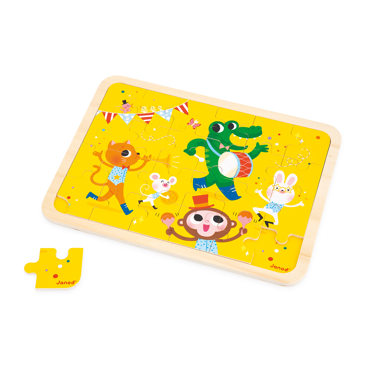 Tchic tchic tchic … La fanfare des animaux commence ! Ce joli puzzle en bois composé de 24 pièces guidera votre enfant au rythme de la musique. Pour faciliter la réalisation du puzzle, un modèle est imprimé sur le fond du plateau. D’ailleurs, 5 différences se sont glissées sur l’illustration du puzzle ! Saurez-vous les retrouver ? Le puzzle est doté d’une petite encoche facilitant le retrait des pièces. Votre enfant pourra développer sa concentration mais également son de l’observation. Jouet d’éveil en bois pour les enfants à partir de 3 ans.