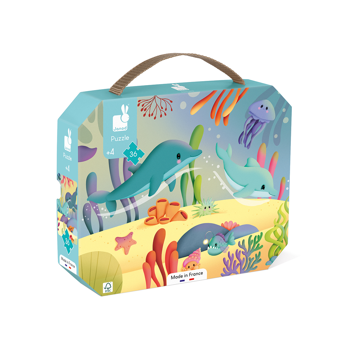 Venez découvrir les profondeurs de l'océan et les animaux qui s'y cachent ! Composé de 36 pièces, ce joli puzzle panoramique en carton sur le thème des animaux marins permettra à votre enfant de s'amuser à reconnaître les différents animaux aquatiques. 1 poster est également inclus pour aider votre enfant dans la réalisation de ce puzzle. Il est facilement transportable grâce à sa jolie valisette. Ce puzzle est idéal pour développer la patience et la motricité fine. Puzzle fabriqué en France et à base d’encres végétales. Puzzle pour les enfants à partir de 4 ans.