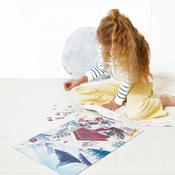 Quel est votre moment préféré après une journée passée à skier ? Ce puzzle de 500 pièces fait la part belle à tous les incontournables d’un après-ski réussi : une bonne fondue au fromage, un chocolat chaud au coin du feu, une couverture confortable, des amis … Et une vue à couper le souffle sur les montagnes enneigées ! Idéal pour les enfants à partir de 8 ans, et pour toute la famille, ce puzzle sur le thème des sports d’hiver vous rappelle à vos bons souvenirs comme à ceux que vous créerez en l’assemblant. Le grand nombre et la taille des pièces font de ce puzzle un vrai challenge où minutie et dextérité seront essentielles pour reproduire la belle illustration. Installez-vous confortablement et profitez de votre soirée puzzle pour vous détendre avec une activité ludique et reposante ! Il n’y a rien de mieux après l’effort. Que vous soyez plus à l’aise au chalet comme dans la poudreuse, sur des skis comme sur une luge, le thème hivernal de ce puzzle vous transportera dans un paysage enchanteur. Se dépasser sur les pistes, déguster des spécialités locales, partager des moments conviviaux en famille ou entre amis : voilà les bons ingrédients pour des vacances d’hiver mémorables ! Une fois assemblé, ce puzzle de 34x48 cm sera un très bel objet à encadrer. Composé de carton et de papier issus de forêts gérées durablement, ce puzzle est cfabriqué en Pologne, il est décoré d’encres végétales. Alors, fartez vos skis !