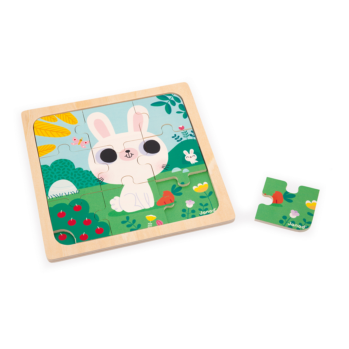 Coucou petit mangeur de carottes! Joli puzzle coloré d’un petit lapin blanc grignoteur de carottes. Ce puzzle est composé de 9 pièces en bois et d’une encoche facilitant le retrait des pièces. Sous le puzzle, se trouve un modèle imprimé idéal pour aider les plus petits. Ludique, ce puzzle permettra à votre enfant de développer sa motricité fine, sa concentration et son autonomie. Jouet d’éveil en bois, pour les enfants à partir de 18 mois.