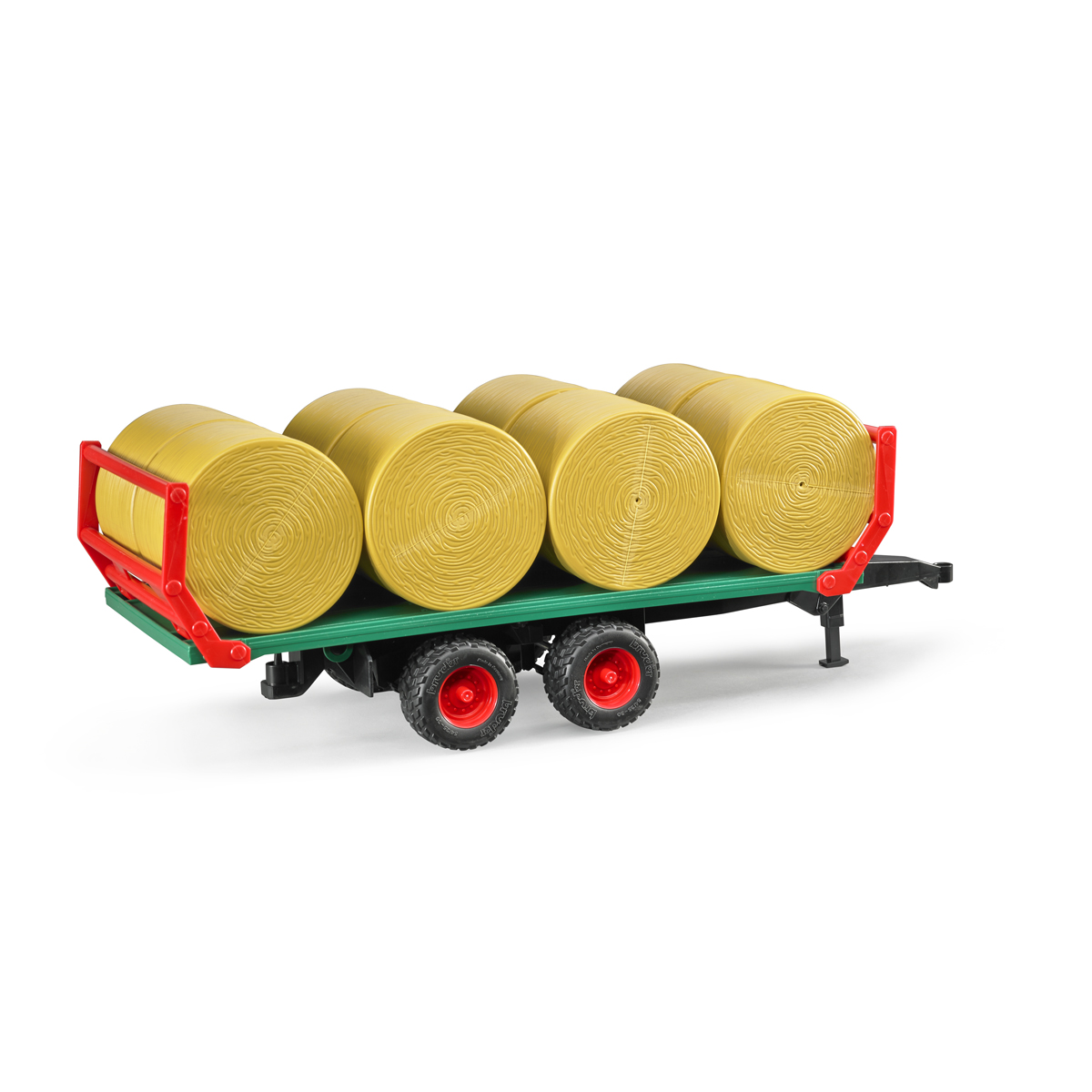 Les ballots de paille et d'ensilage souvent visibles dans les champs en automne doivent être transportés de manière adéquate du champ à l'étable ou la grange. Ce type de transport nécessite généralement une remorque spéciale, qui est désormais également disponible dans notre gamme de produits. Notre modèle se caractérise par son échelle escamotable et comprend 8 ballots. Tous nos tracteurs avec chargeur et fourche peuvent être utilisés pour décharger la remorque, ce qui forme un kit de jeu fonctionnel. Les presses à ballots sont parfaitement compatibles avec ce modèle de jouet (art. 02121, 02015 et 02017) ainsi que l'enrubaneuse (art. 02122)