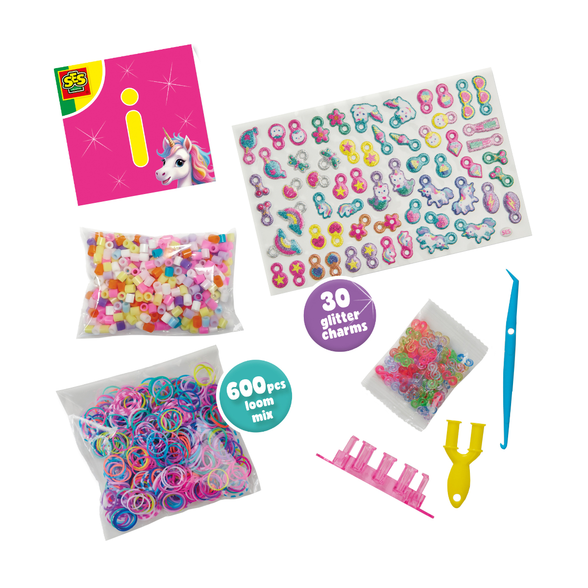 Créez vos propres bracelets licorne tendance avec le kit de tissage Licorne! Explorez un univers créatif et réalisez d'adorables bijoux licorne grâce au kit de tissage Licorne Créatif SES. Confectionnez des bracelets (d'amitié) seul(e) ou entre amis. Les perles spéciales et les breloques licorne à faire soi-même les rendent encore plus beaux! Ce kit est génial car il contient: 600 élastiques à tisser au motif licorne tendance, des breloques licorne pailletées à faire soi-même pour encore plus de créativité, des perles de 8 couleurs différentes pour embellir vos créations, un plaisir à partager, ainsi que des instructions et des outils pour différentes techniques de tissage.