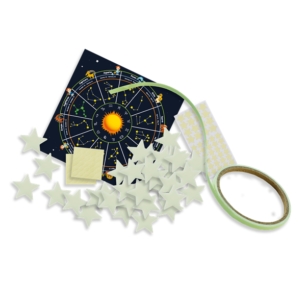 Transformez votre chambre en une nuit étoilée avec cet ensemble de signes du zodiaque lumineux. Dessinez la constellation de votre signe astrologique ou de celui d'une autre personne et apprenez tout sur le zodiaque. Grâce à l'effet Glow in the Dark spécial, vos étoiles prendront vie la nuit ! Ce set contient différents autocollants d'étoiles et du ruban adhésif qui brille dans le noir et peut être fixé au mur. À l'aide des instructions, vous pouvez facilement réaliser les douze constellations du zodiaque. Contenu : 40 étoiles Glow in the Dark, 46 autocollants Glow in the Dark, ruban adhésif Glow in the Dark de 3 m, explications des signes des étoiles.