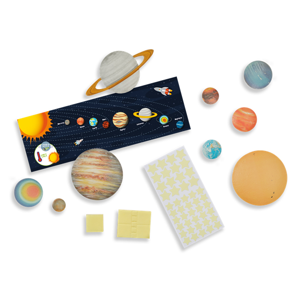 Rêvez-vous de visiter les planètes ? Transformez votre chambre à coucher en un magnifique système solaire. Non seulement c'est vraiment cool, mais c'est aussi très éducatif. Découvrez toutes les différentes planètes ! Les 9 planètes et étoiles sont faciles à fixer au mur ou au plafond. L'effet spécial de brillance dans l'obscurité fera briller votre chambre à coucher la nuit ! Contenu : 9 planètes, 46 autocollants phosphorescents, explication du système solaire.