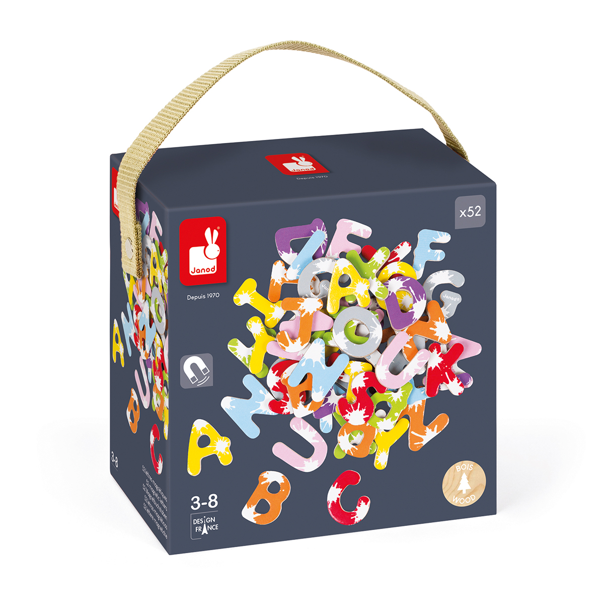 Mallette avec 52 lettres, jouet en bois pour enfants de 3 à 8 ans. 52 magnets 3.5x0.4x4cm (2 sets de 26 lettres) pour tableaux (ou autre surface magnétique). Idéal pour apprendre à écrire tout en s'amusant.