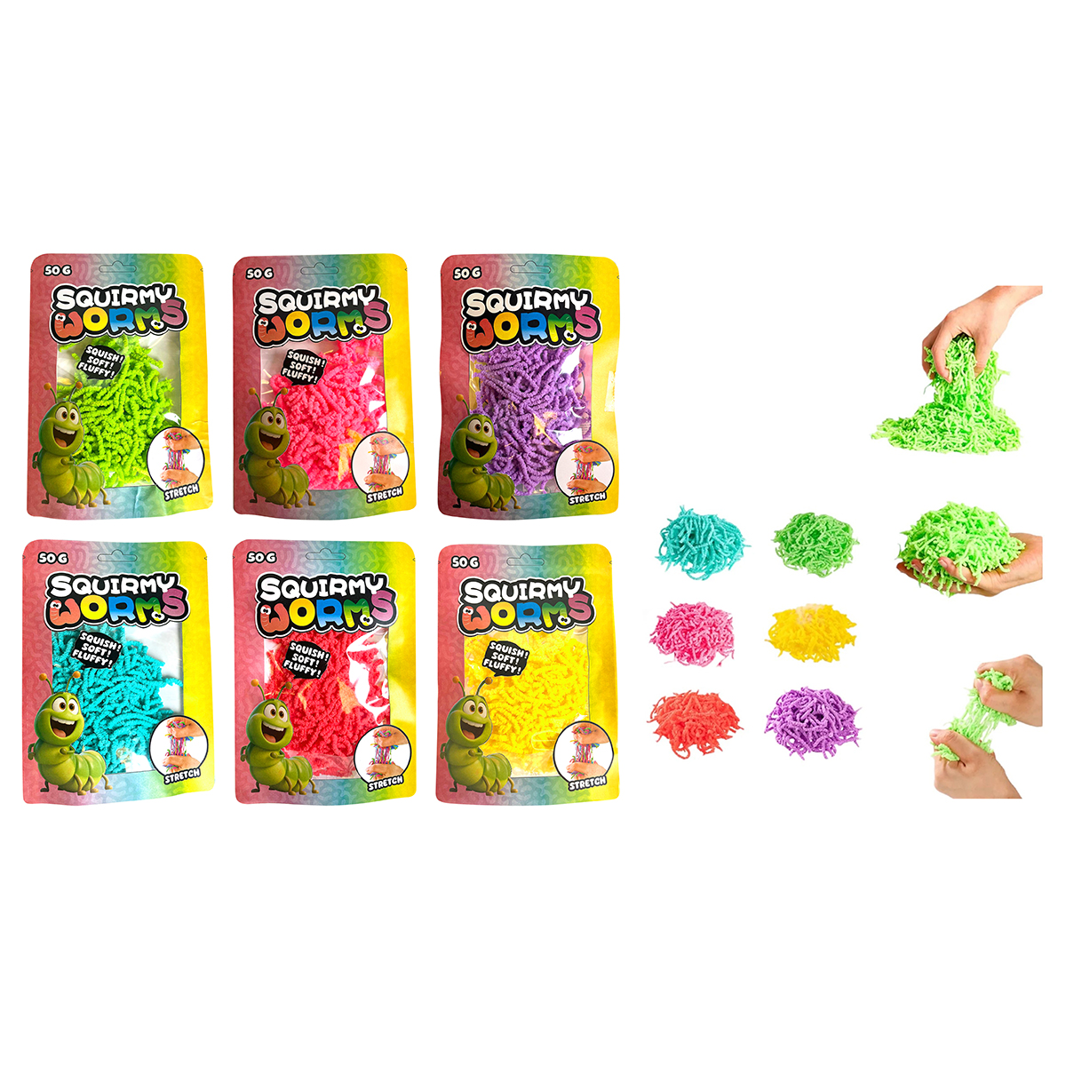 Squirmy worms 50g, 6-fois assortis en sac. Stretch, soft, fluffy et squish.