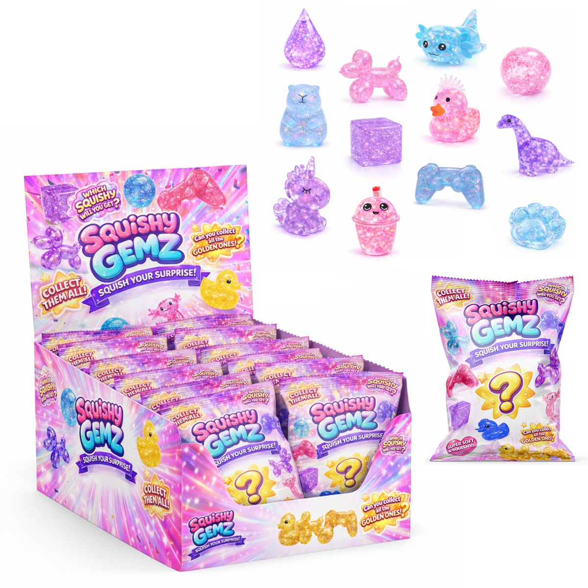 Les Squishy Gemz sont des jouets souples et colorés à collectionner, cachés dans des sachets surprise qui réservent une joyeuse surprise au moment de les déballer. Chaque sachet contient une figurine ultra-douce et malléable, remplie d'effets de pierres précieuses scintillantes. Avec un large choix de figurines et de formes mignonnes à collectionner, notamment des animaux, des motifs originaux et des personnages rigolos. Des versions dorées rares ajoutent encore plus de suspense.