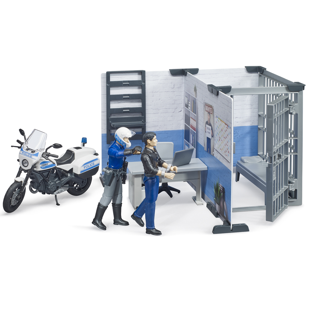 Le poste de police bworld permet désormais de coordonner les nombreux véhicules de police BRUDER. Dans l’espace de bureau, le policier peut coordonner et suivre chaque intervention à l’aide d’un équipement à la pointe de la technologie. Si un suspect est arrêté, il peut être placé dans la cellule. Pour pouvoir intervenir rapidement, la moto de police Scrambler Ducati est stationnée devant le poste de police. Le poste de police bworld peut être facilement combiné avec les autres kits thématiques bworld. Dans la gamme de véhicules de sauvetage et d’intervention de BRUDER, la Land Rover Defender Station Wagon (réf. 310.02597) et la Jeep Wrangler Rubicon (réf. 310.02526) sont particulièrement compatibles.