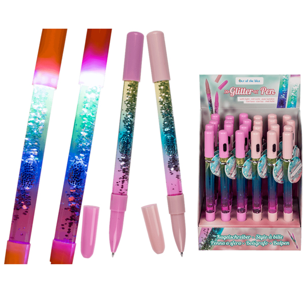 Stylo à bille avec Glitter & LED (piles inclus), env. 15 cm, en plastique, 2 couleurs ass., 24 pièces dans présentoir