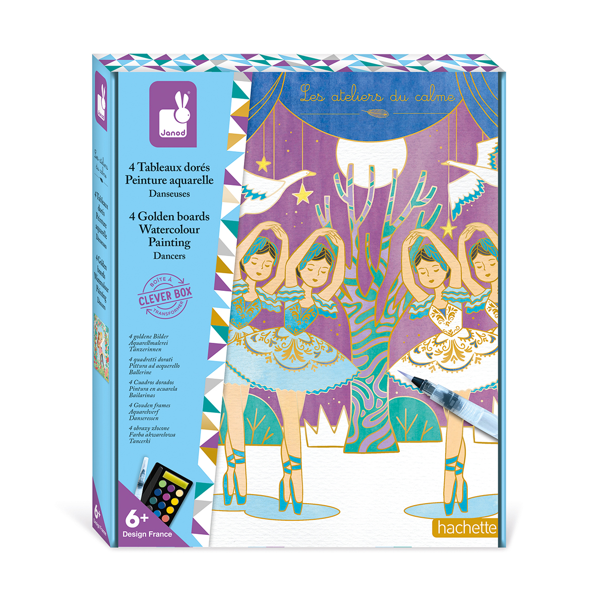 Les artistes dès 6 ans vont adorer réaliser ces tableaux en aquarelle d'une incroyable beauté! De somptueux danseurs n'attendent plus que de délicates couleurs à appliquer au pinceau pour prendre vie! Ce kit créatif est composé de 4 tableaux représentant de jolies scènes de danse à l'opéra, en ville, en pleine nature... On adore d'abord le principe du pinceau à réservoir d'eau pour faciliter l'application des couleurs de la palette aquarelle de 15 teintes. Ensuite, quelle bonne idée ces traits en dorure qui empêchent de dépasser et donc de mélanger les couleurs! Ils donnent en plus un rendu très raffiné aux tableaux. Enfin, la boite se transforme en un joli cadre pour mettre en valeur les créations! Cette activité permet de développer la motricité fine et la patience. 1h est nécessaire par tableau pour finaliser l'œuvre de nos artistes.