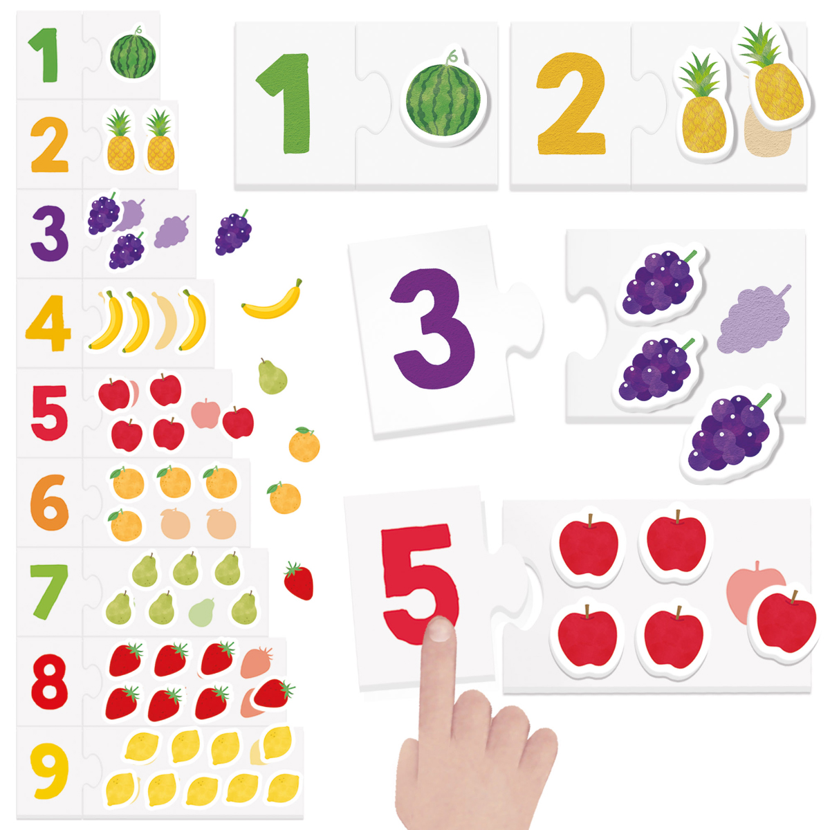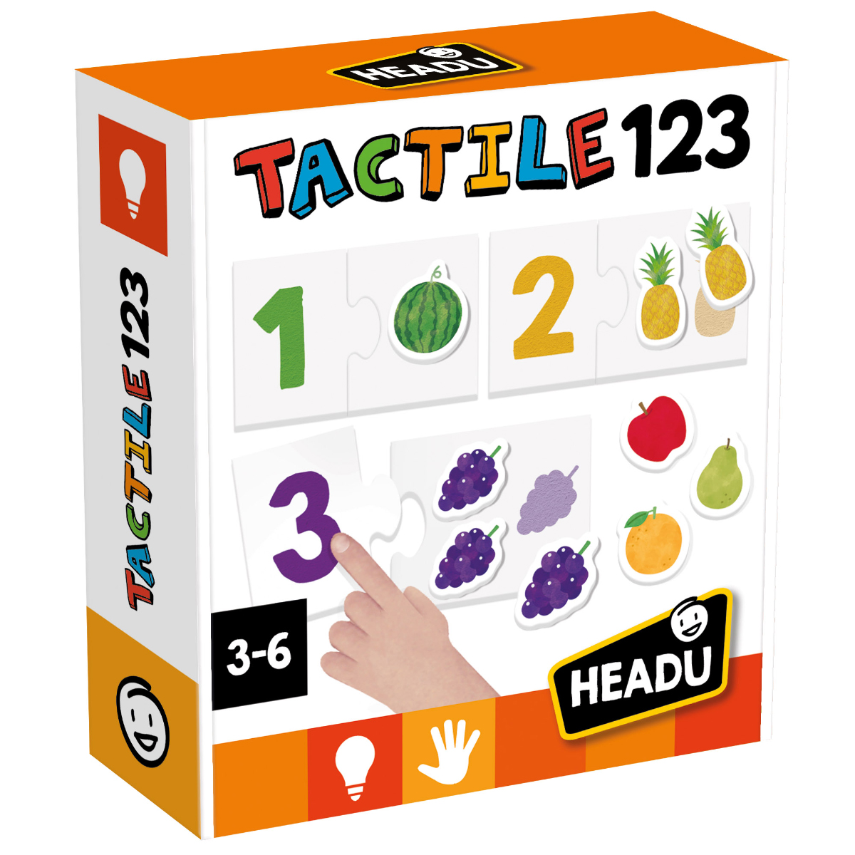 Combien y a-t-il de pommes? Et de poires? Un jeu original où les enfants comptent d'abord les formes tactiles des fruits, puis associent le symbole numérique à la quantité correspondante, et enfin classent les nombres du plus grand au plus petit. Ce jeu permet de développer les compétences suivantes: compter les nombres de base, associer nombres et quantités, comparer et classer, et exercer sa sensibilité tactile. Intelligence principale: logico-mathématique. Autres intelligences sollicitées: kinesthésique et visuo-spatiale. Contenu: 18 formes rugueuses auto-correctrices et 45 formes de fruits tactiles.