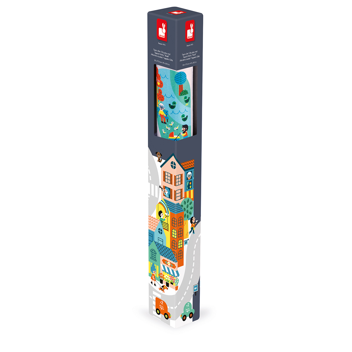Bienvenue dans cette ville colorée et animée où chaque coin de rue cache une surprise ! Ce tapis de jeu sur le thème de la ville possède une large et longue route pour découvrir chaque quartier et imaginer des histoires à l’infini ! En plus de stimuler l’imagination, le tapis à une fonction de cherche et trouve et permet de développer le vocabulaire. Saurais-tu retrouver le facteur ? Avec le thème de la ville, apprenez à votre enfant les métiers, les couleurs et les émotions. Le petit plus : le tapis est anti-dérapant ! Ainsi, votre enfant pourra facilement faire rouler ses petits véhicules et jouera en toute sécurité. Jouet d’imitation pour les enfants à partir de 2 ans. Ton tapis peut être complété d’une jolie panoplie de véhicules et de cubes en bois à retrouver dans la gamme Janod. Tu peux aussi l’associer aux autres tapis de la gamme pour créer un espace de jeu géant !